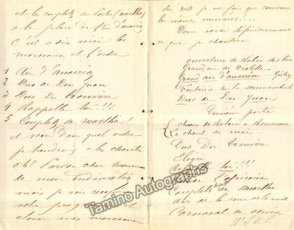 French bass (1836-1871), created the role of Capulet in the world premiere production of Gounod's Romeo et Juliette. Autograph letter signed, 4 pages, dated in Paris in 1866, written in French and sold untranslated. Clear and bold handwriting and signature. Each page is 5.25 x 8.25 inches, folds and several bullet holes, in otherwise very good condition.