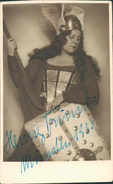 Signed photo postcard of the German soprano (1897-?), shown as Brunnhilde, dated in Munich in 1933. Size is 3.25 x 5 inches, blind stamped on front by photographer Graben, Vienna, in excellent condition