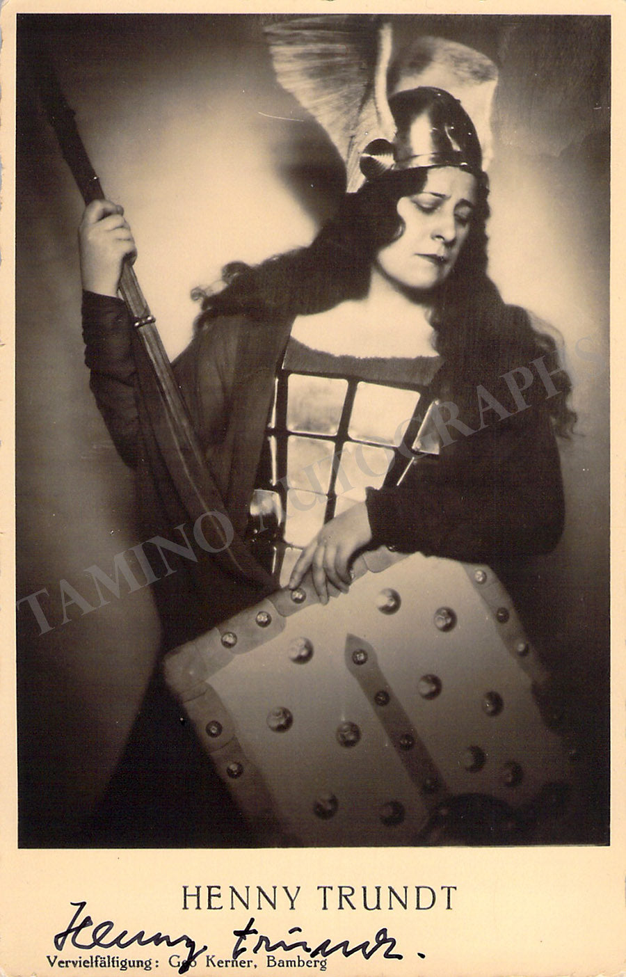 Signed postcard photograph, shown as Brunnhilde in Wagner's Die Walkure. Photo by George Kerner, Bamberg. Size is 3.5 x 5.5 inches, in excellent condition.