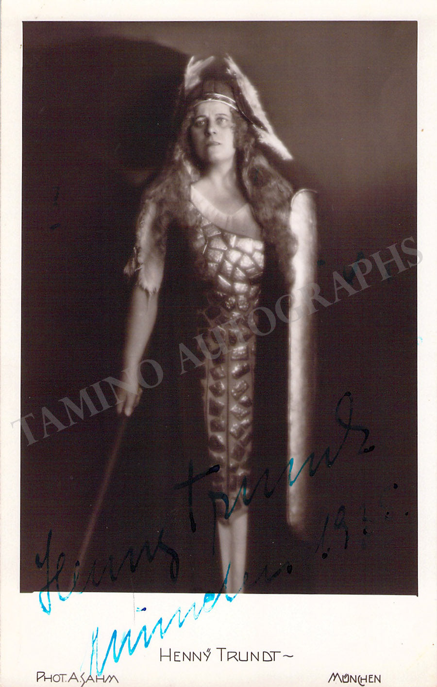 Signed postcard photograph, shown as Brunnhilde in Wagner's Die Walkure. Photo by A. Sahm, Munich. Size is 3.5 x 5.5 inches, some bends, otherwise in excellent condition.