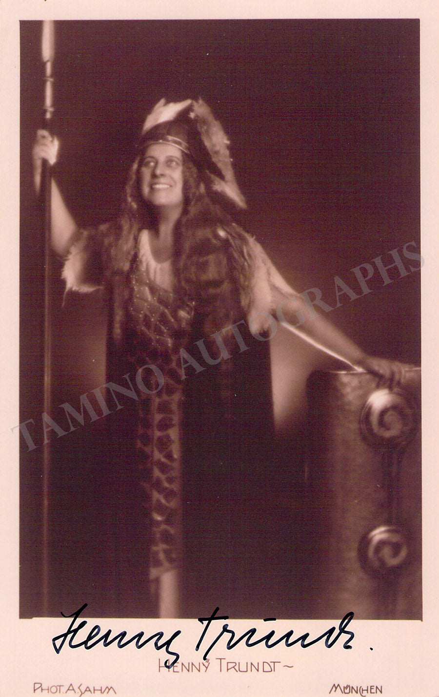 Signed photograph, shown as Brunnhilde in Wagner's Die Walkure. Photo by A. Sahm, Munich. Size is 3.5 x 5.5 inches, some bends, otherwise in excellent condition.