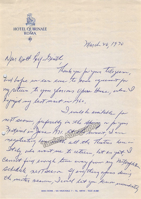 Autograph letter signed, 2 pages written in English on the letterhead of the Hotel Quirinale, in Rome in 1970. Contains a lot of interesting information regarding his upcoming scheduled performances as well as his overall availability. Size is 7.5 x 11 inches, in excellent condition.
