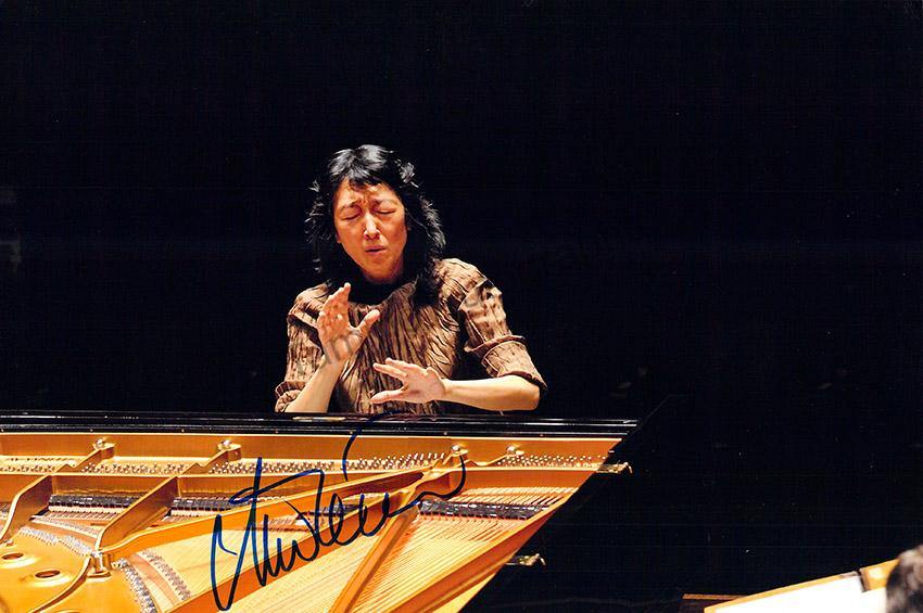 Japanese-British pianist (b.1948), internationally acclaimed today.  Larger size color photo signed by her, shown in performance.  Size is 12 x 8.3 inches, in very good condition.
