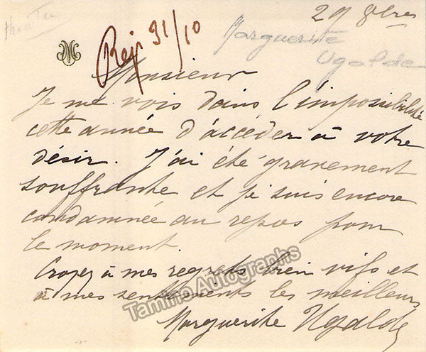 French soprano (1862-1940), autograph note signed on an embossed card, 1 page written in French, sold untranslated. Size is 3.5 x 4.25 inches, in excellent condition.