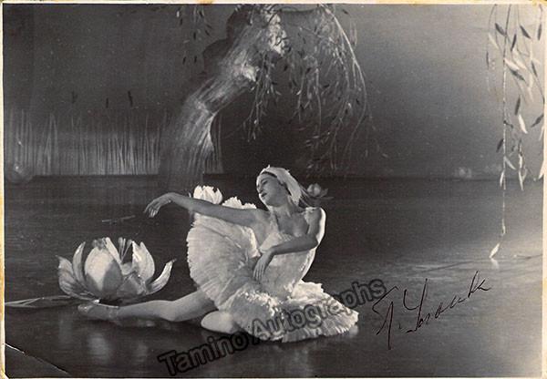 Russian star ballet dancer (1910-1998), one of the greatest of the 20th century. Signed photo, shown in Swan Lake. Size is 6.25 x 4.25 inches. Some mounting traces on verso, otherwise in very good condition.