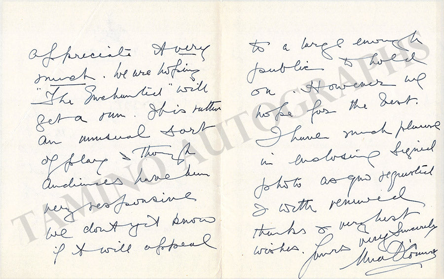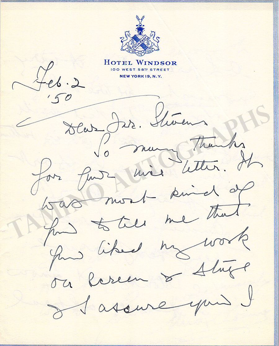 Autograph letter signed by her and dated in New York, 1950. Size is 5.3 x 6.7 inches, 3 written pages, in excellent condition.
