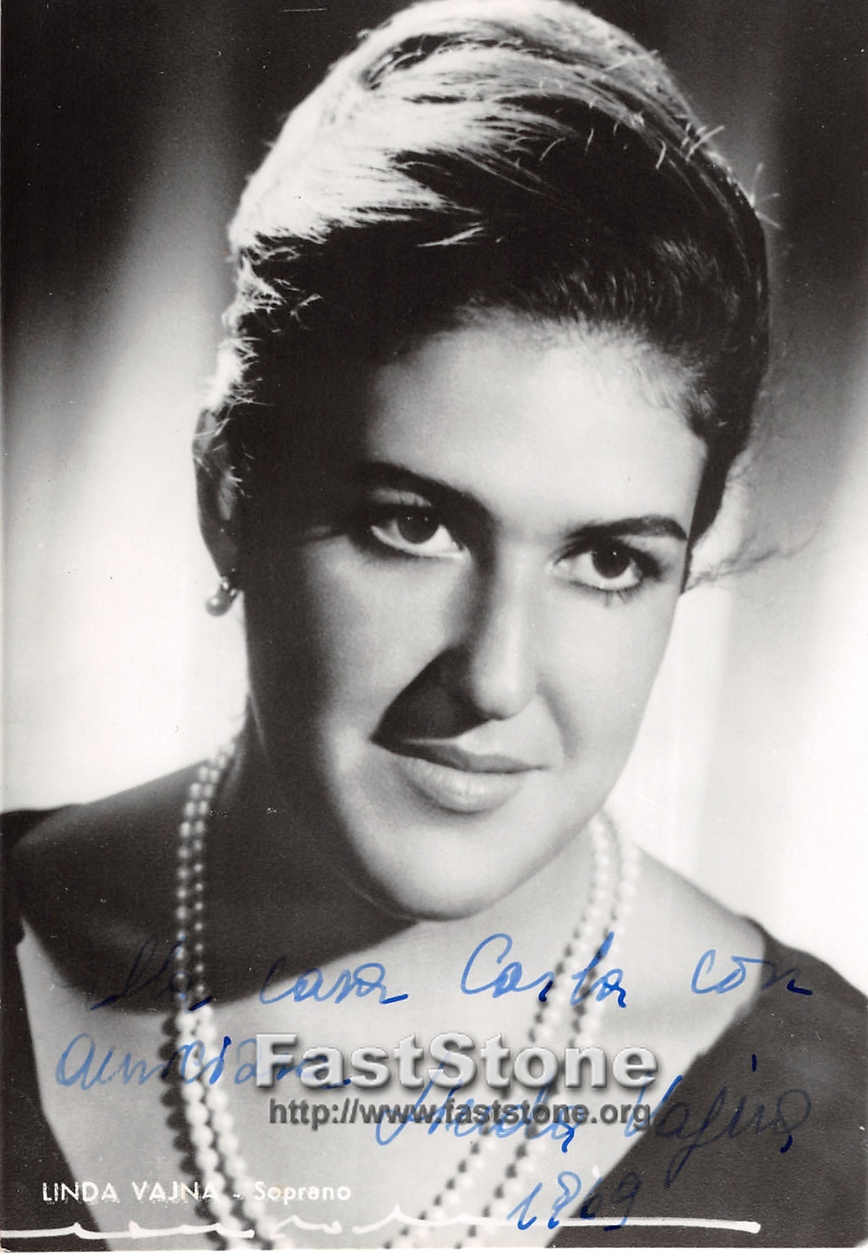 Italian soprano, signed photograph, shown as herself, dated in 1969. Size is 4 x 5.75 inches, very slight paper loss on edges, otherwise in excellent condition.