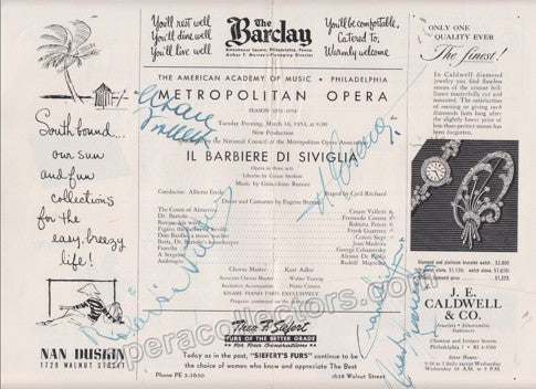 Cast page from a performance of Rossini's Il Barbiere di Siviglia at the Metropolitan Opera, New York, 1954, signed by the 5 artists.