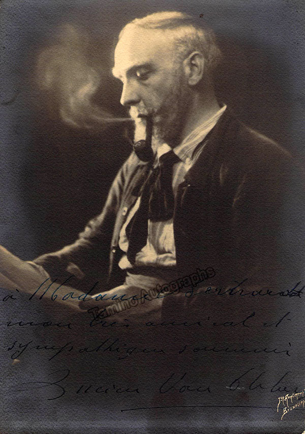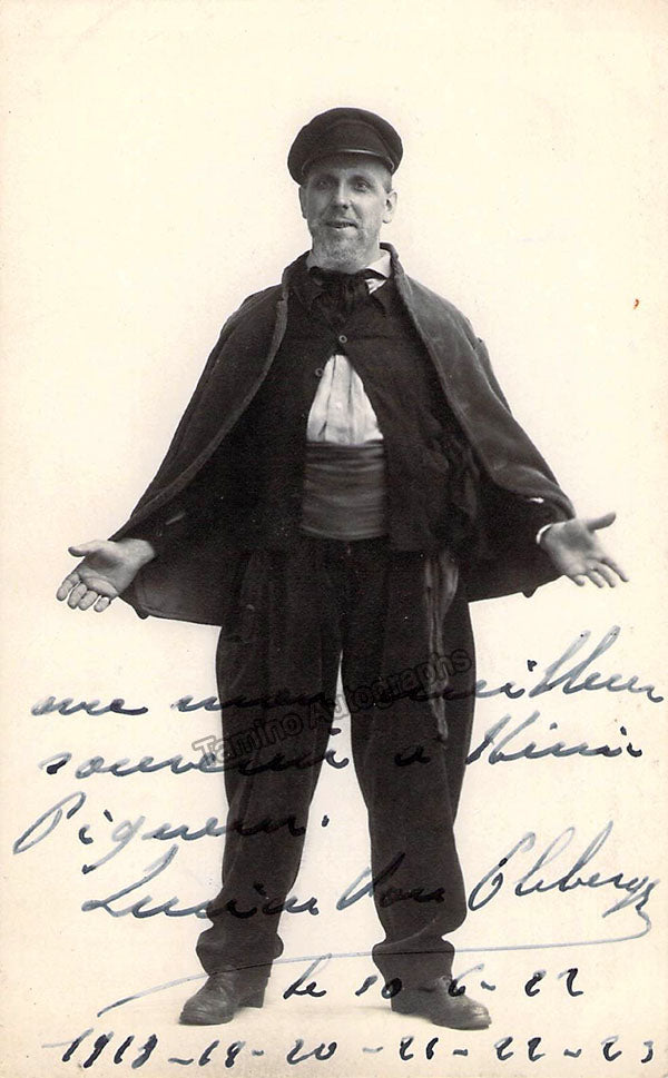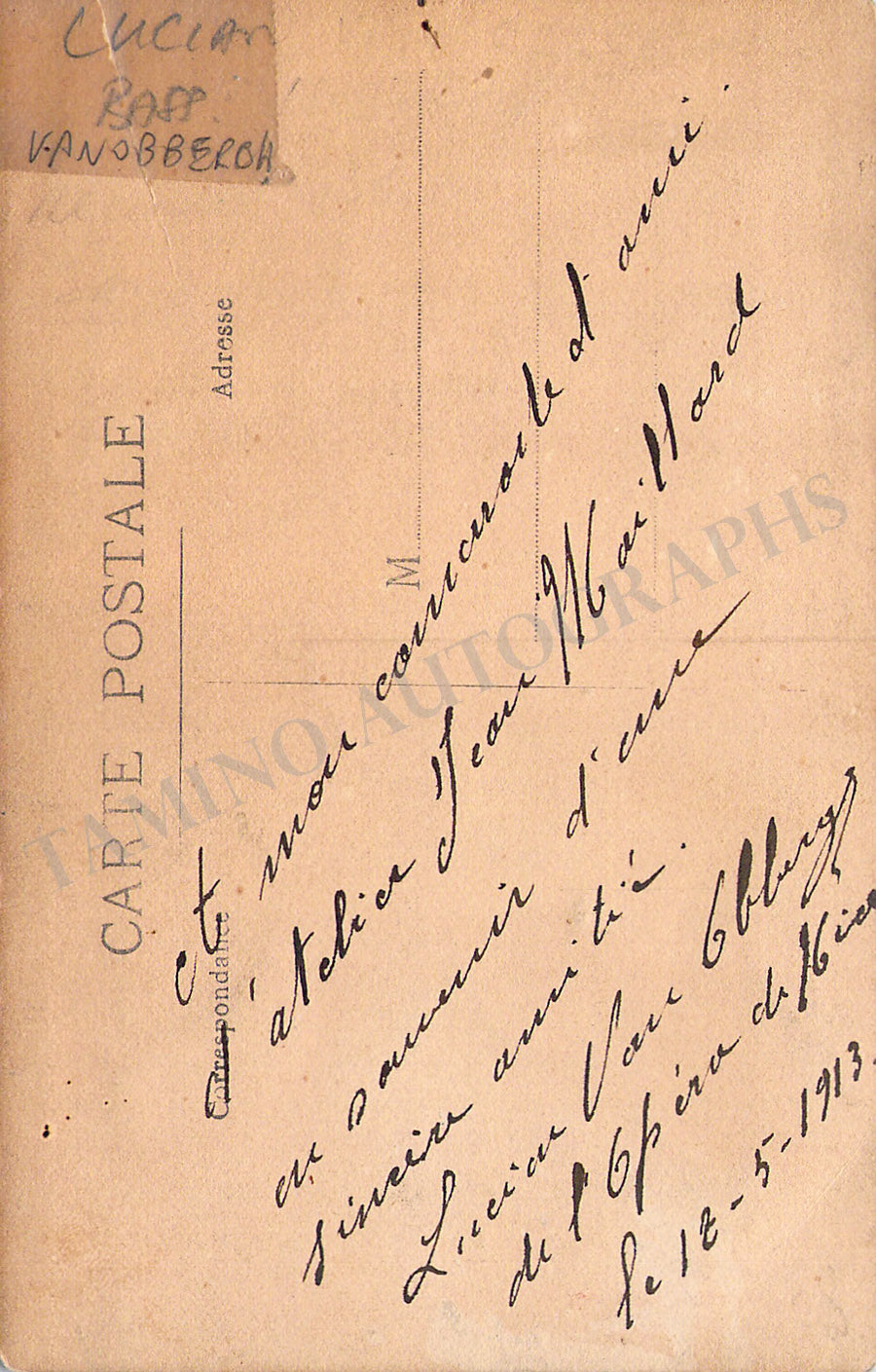 Signed postcard photograph, shown in role in Charpentier's Louise, inscribed. Blind stamped on front and stamped on verso by photographer Heneman, Brussels. Size is 3.25 x 5.5 inches, in very good condition.