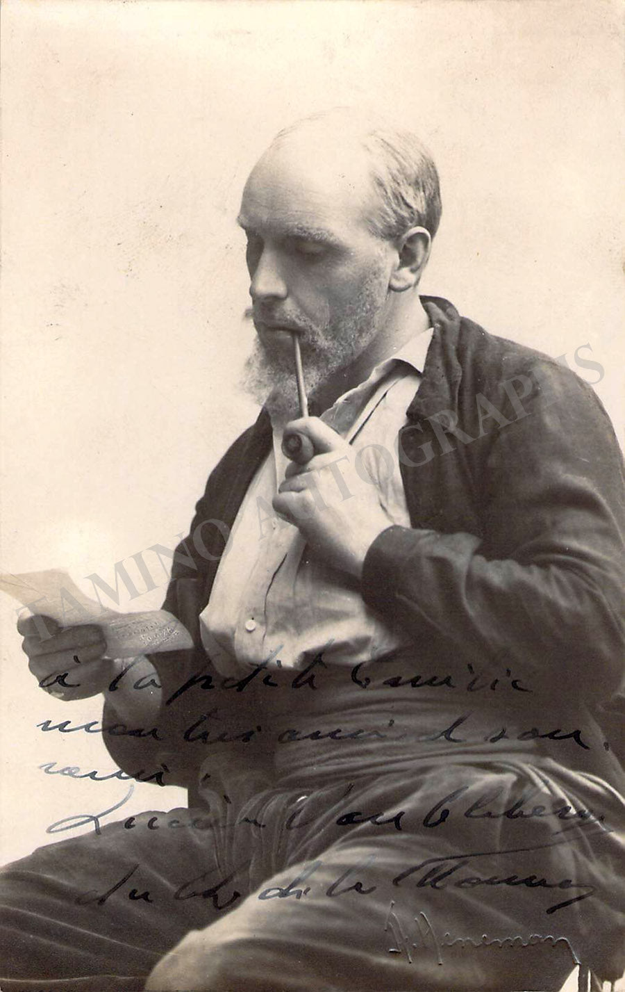 Fine photo postcard signed by him on the verso with a short sentiment in French dated 1913. Size is 3.4 x 5.4 inches, repaired crack over the upper-right corner, in overall very good condition.