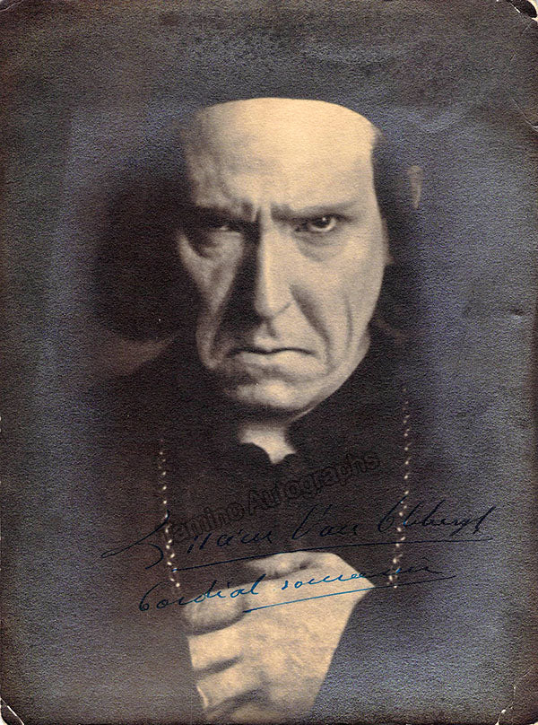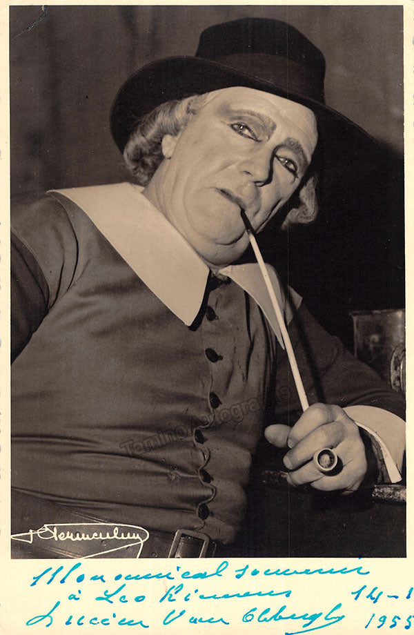 Signed photograph, shown in role, inscribed and dated in 1955. Printed signature on front and stamped on verso by photographer Henri Vermeulen, Brussels. Size is 4.5 x 6.75 inches, in excellent condition.