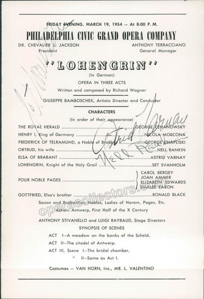 Cast page from a performance of Wagner's Lohengrin at Philadelphia Civic Grand Opera, 1954, signed by the three artists.