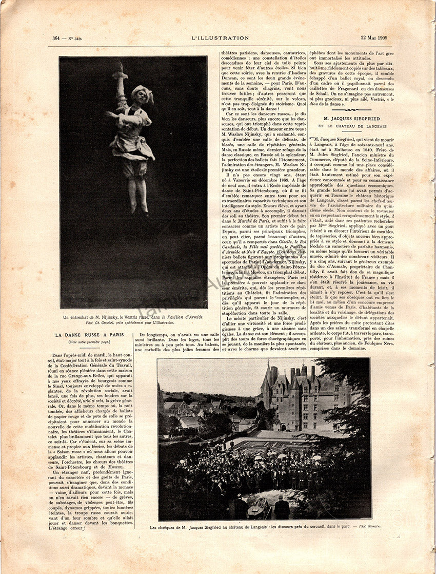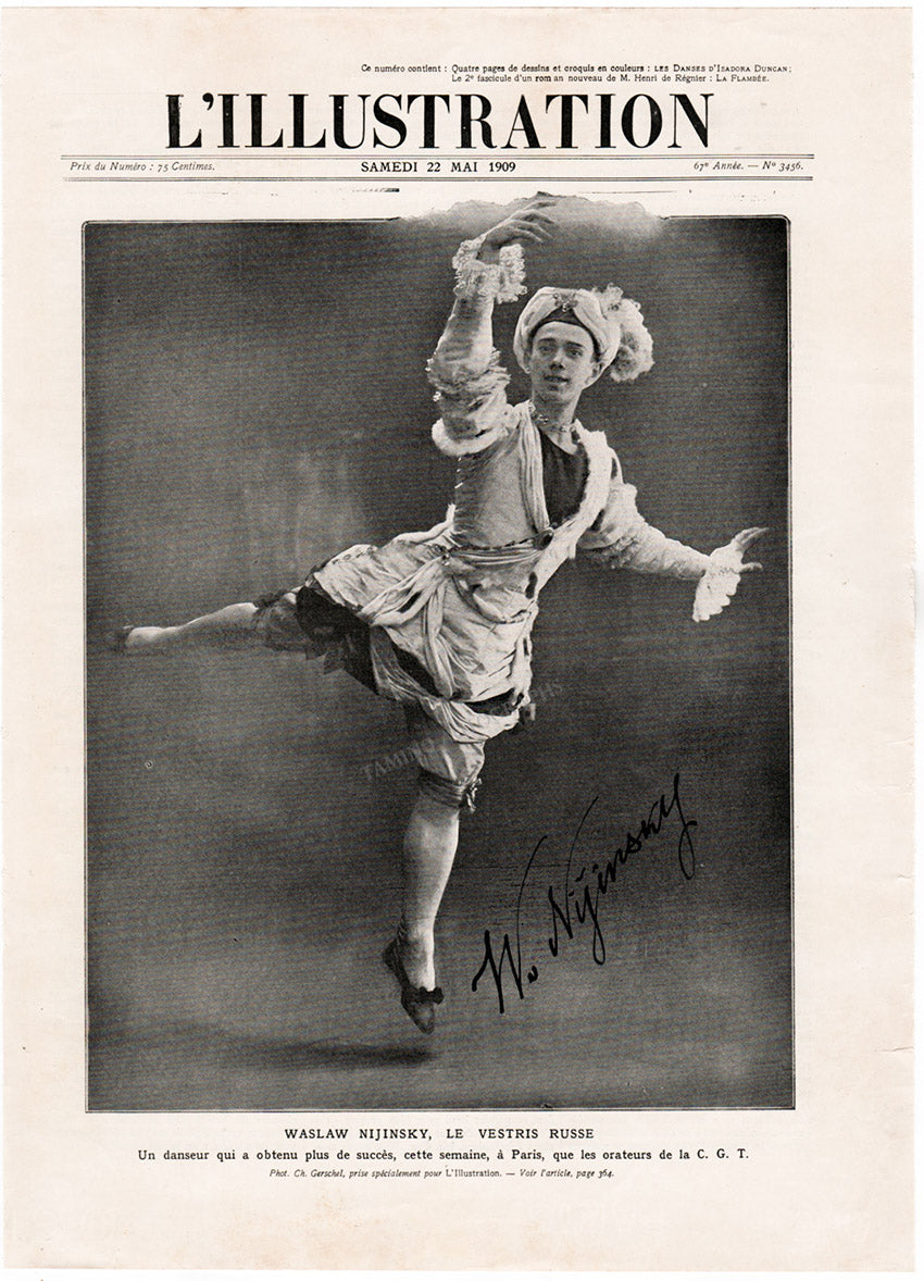 Original front cover of the magazine "L´Illustration", published in Paris on May 22nd, 1909, right after his debut in Paris at age of only 19!. Nijinsky caused quite an impression in the Parisian public, and this publication calls him "The French Vestris" (referring to famous French dancer Auguste Vestris (1760-1842)) on the front cover.