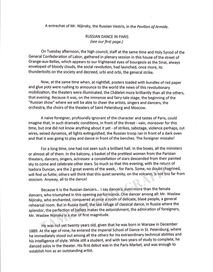 Nijinsky, Vaslav - Large Signed Photo Print of his Paris Debut 1909