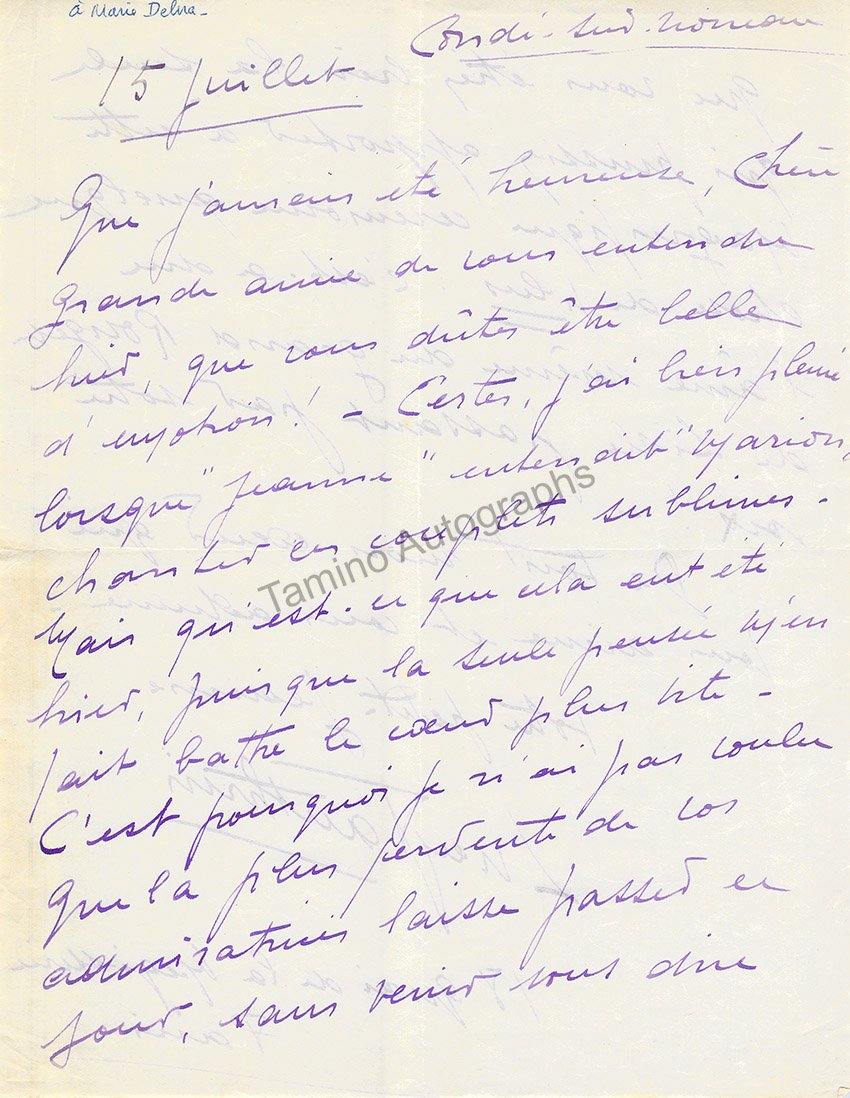 French soprano (1885-1945), autograph letter signed, 2 pages, written on both sides of a 8 x 10.5 inch sheet. Written in French, sold untranslated, in excellent condition.