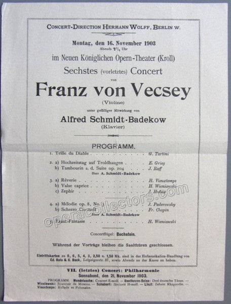 Berlin, Kroll-Oper, 16. November 1903. Franz von Vecsey, Violin. Alfred Schmidt-Badekow, Piano. Works of - Tartini – Grieg - Raff – Vieuxtemps - Wieniawski – Hubay - Paderewski – Chopin. 24,5 x 18,5 cm. 1 page.