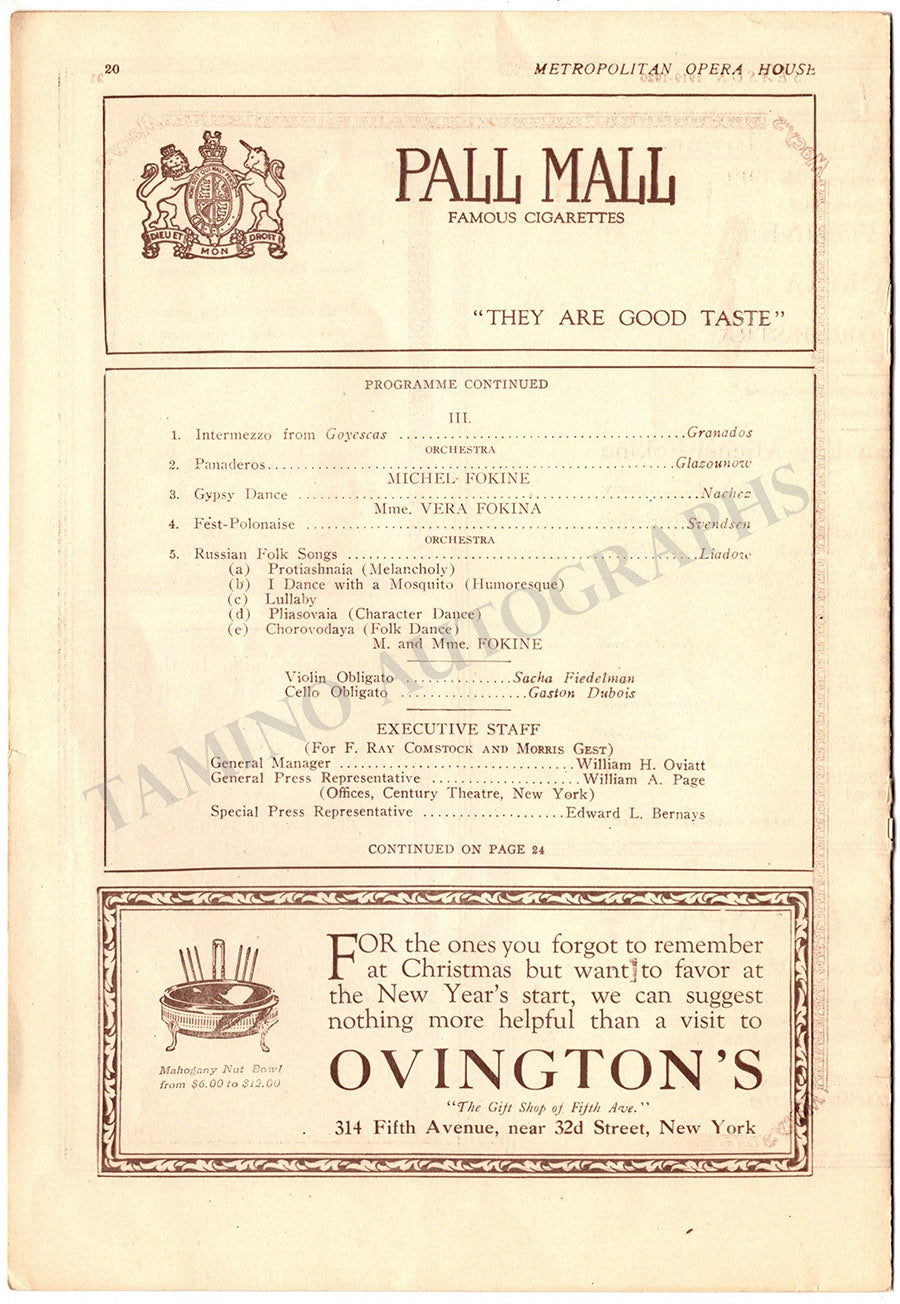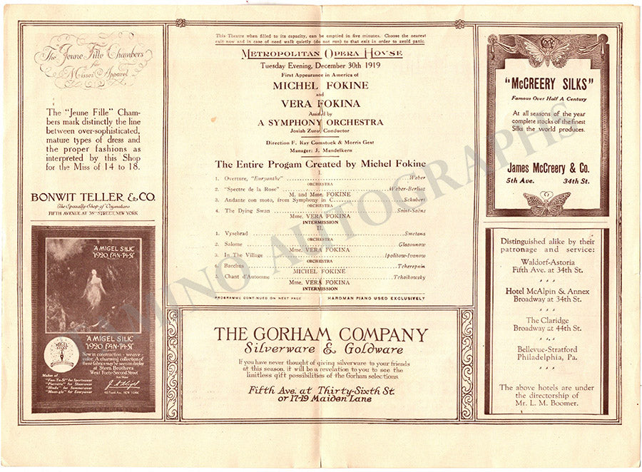 Cast page (only) for a performance of the married couple with the American Ballet Company at the Metropolitan Opera House on December 30, 1919.  Size is 6.75 x 10 inches, in excellent condition.