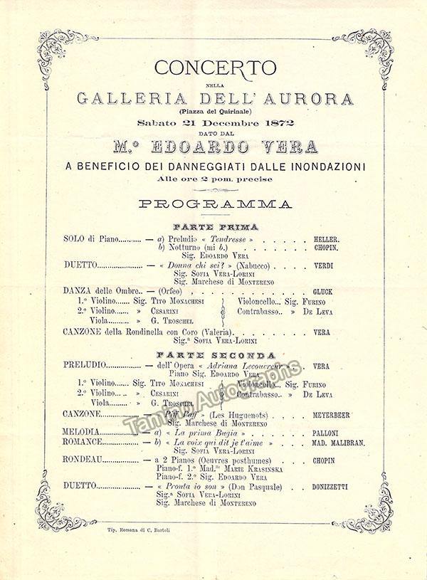 ALSO INCLUDED is an unsigned playbill for a recital concert in 1872 accompanied by her husband, pianist Eduardo Vera. Size is 7.75 x 10.5 inches, in excellent condition.