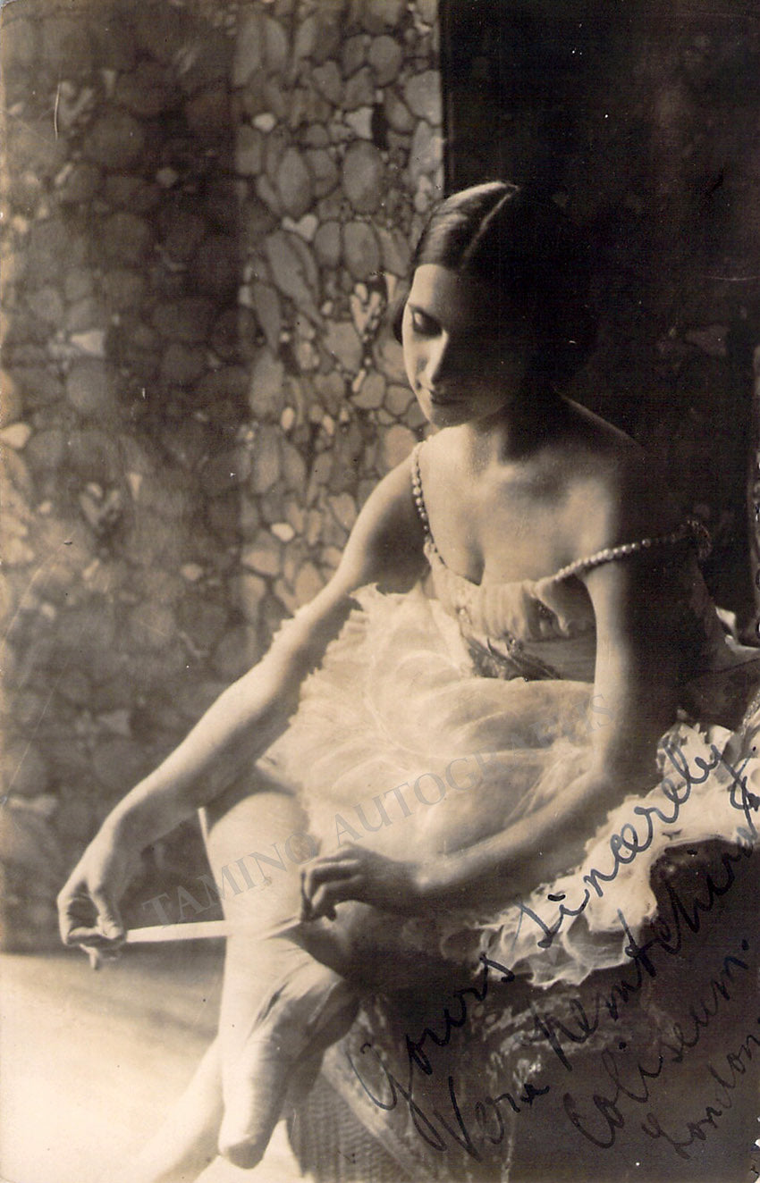Gorgeous black-and-white photograph signed by her, shown young while preparing for a performance. Size is 3.5 x 5.3 inches, minor silvering around borders, in excellent condition.