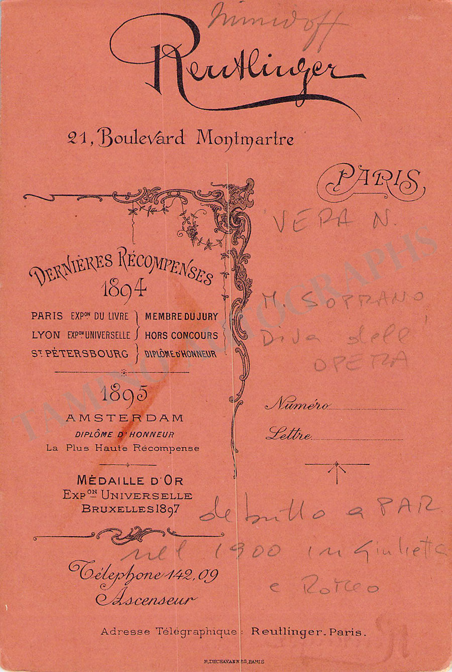 Fine cabinet photograph of her by photographer Leopold-Emile Reutlinger (Paris) from 1900. Size is 6.2 x 4.2 inches, ink writing, in very good condition.