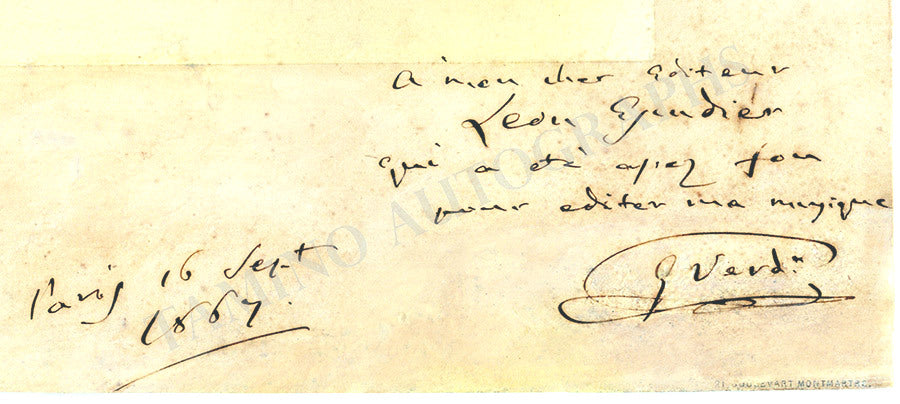 Dated by Verdi in Paris, Sept 16th, 1867, the size is 13.8 x 17.8 inches, probably the largest signed photo of this composer we have ever seen. Great contrast, has been professionally restored to clean and remove rust, some signs of age but in overall very good condition.