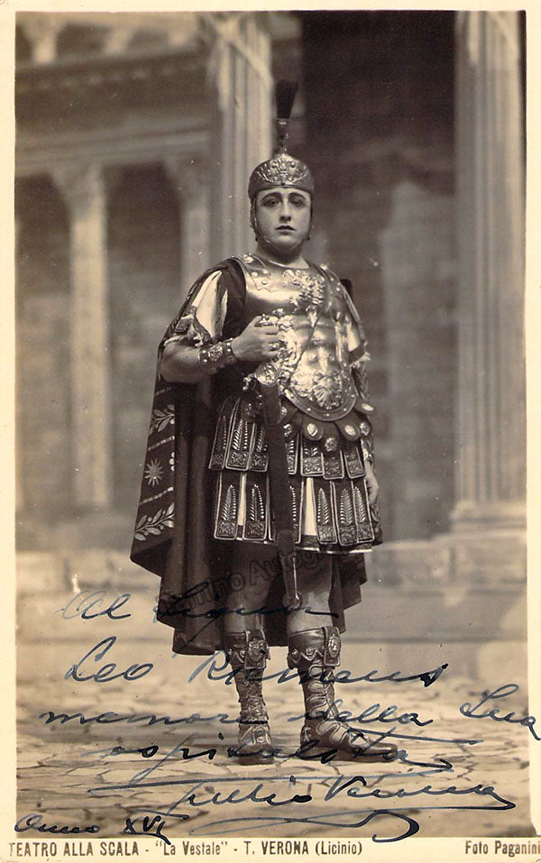 Italian tenor (? 1897-1939), had a successful career at the major Italian opera houses, including La Scala, Bologna, Verona, Palermo, Rome, Trieste and Geno, made guest appearances elsewhere in Europe and left several recordings. Signed postcard photograph, shown as Licinio in Spontini's La Vestale, inscribed. Photo by Paganini, La Scala, Milan. Size is 3.5 x 5.5 inches, in excellent condition.