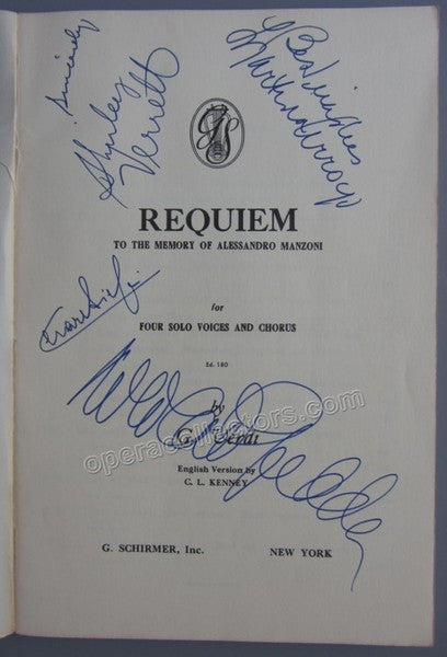 Requiem (Verdi) full score for singers and piano, signed on page 1 by these 4 performers. Complete, with all 212 pages and covers, in excellent condition, published by Schirmer, NY. Size is 7 x 10.25 inches