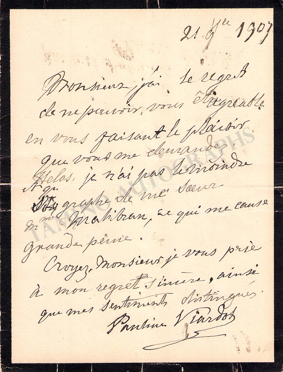 French mezzo-soprano (1821-1910), short autograph letter signed, 1 page, dated in 1907. Written in French, sold untranslated. Size is 5 x 6.5 inches, small smudges on the top and bottom corners of the document not affecting the text and bold signature, otherwise in very good condition.