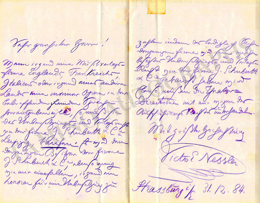 Autograph letter signed by him, dated in Strasbourg 31/12/1884, to his music publisher agent concerning international publishing royalties. Open size is 10.4 x 8.1 inches, 2 written pages in one folded sheet, tape residues over the top, in overall very good condition.