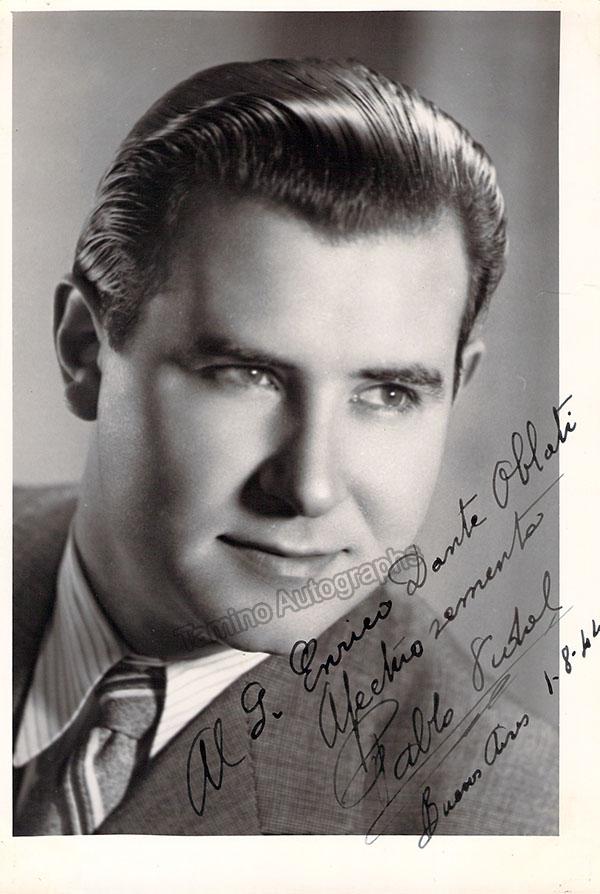 Spanish baritone (1913-1998), signed photo, shown as himself. Inscribed, signed in Buenos Aires, dated in 1944. Stamped on verso by photography studio Foto Babino, Buenos Aires. Size is 4.75 x 7 inches, in excellent condition.