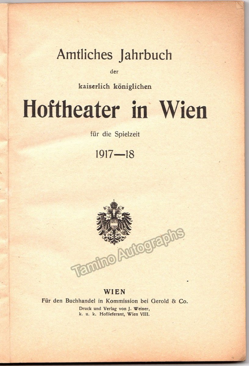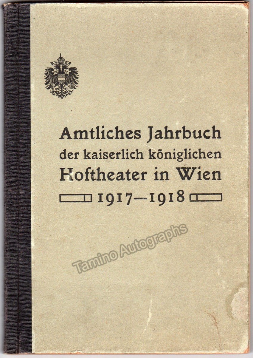 Extremely rare year book of the Vienna Royal and Imperial Hof Theater (Vienna Court Opera) covering the period 18 August 1916 to 15 June 1917. A compendium of all 262 performances, listing of all operas, general information and small biographies of conductors and singers. First season of Leo Slezak at the Vienna Opera. Chief conductor: Franz Schalk. Guest performances of Richard Strauss and Wolfgang Korngold as conductors. Hardcover, 150 pages.