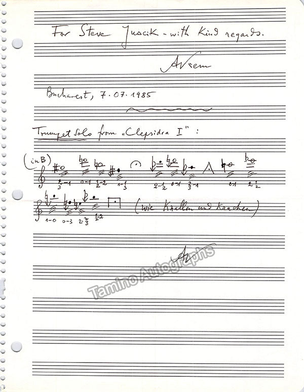 Full page autograph music quote with some bars from his choral work "Clepsidra I" signed and inscribed by him, dated in Bucharest, 1985.  Size is 8.5 x 10.9 inches, in excellent condition.