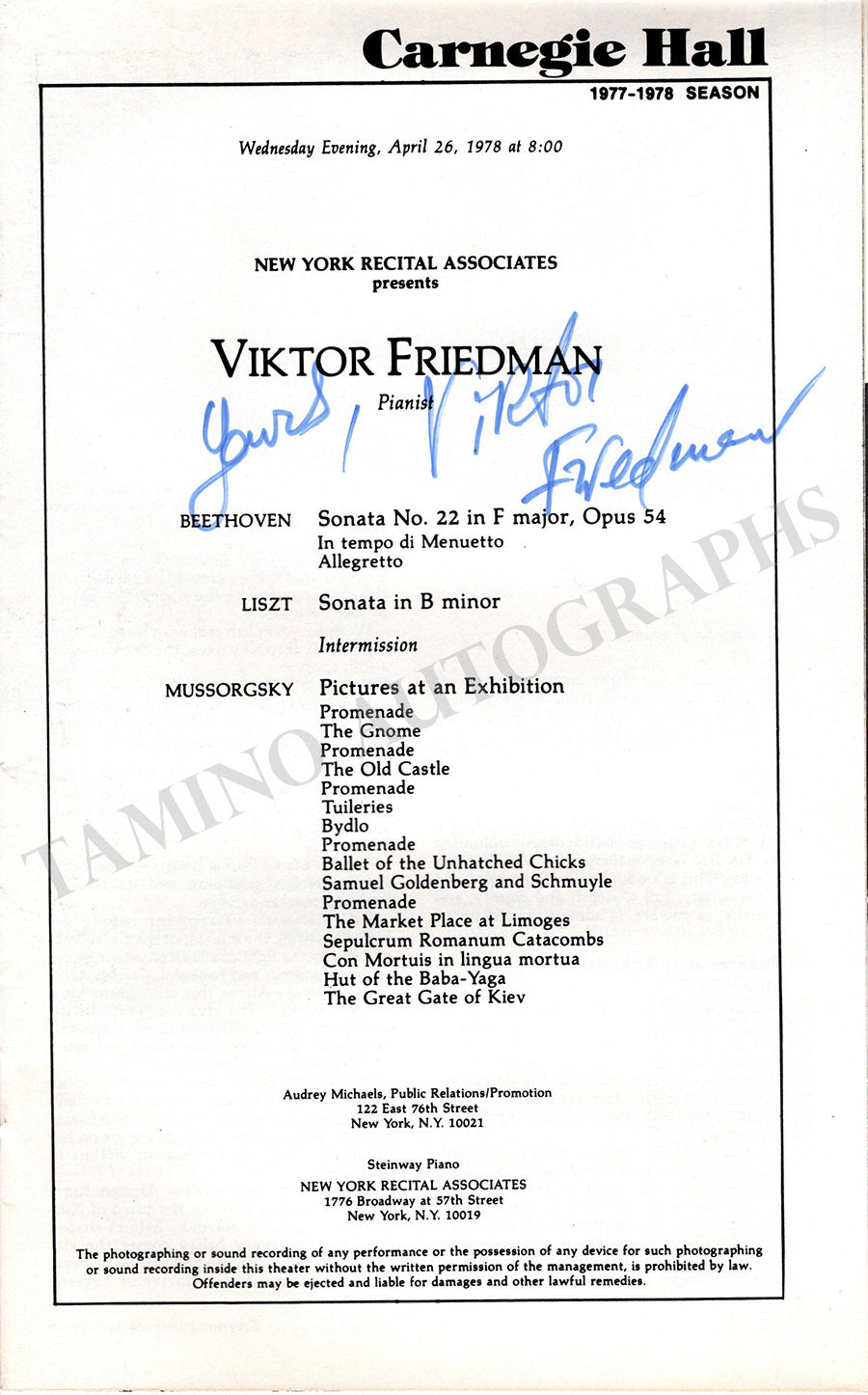 Original program for a recital at Carnegie Hall, New York, April 26, 1978, by the American pianist Viktor Friedman and signed by him, performing works by Beethoven, Liszt, and Mussorgsky.