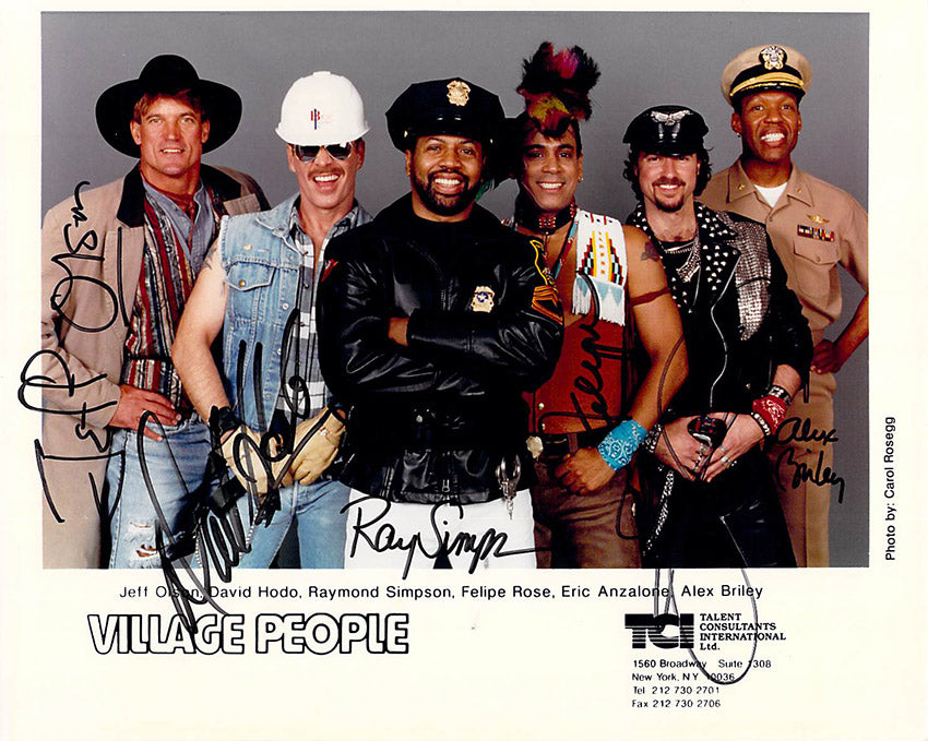 Gorgeous color promo photograph signed by all the members of the band, including Jeff Olson, David Hodo, Raymond Simpson, Felipe Rose, Eric Anzalone, and Alex Briley.  Size is 10 x 8 inches, in excellent condition.