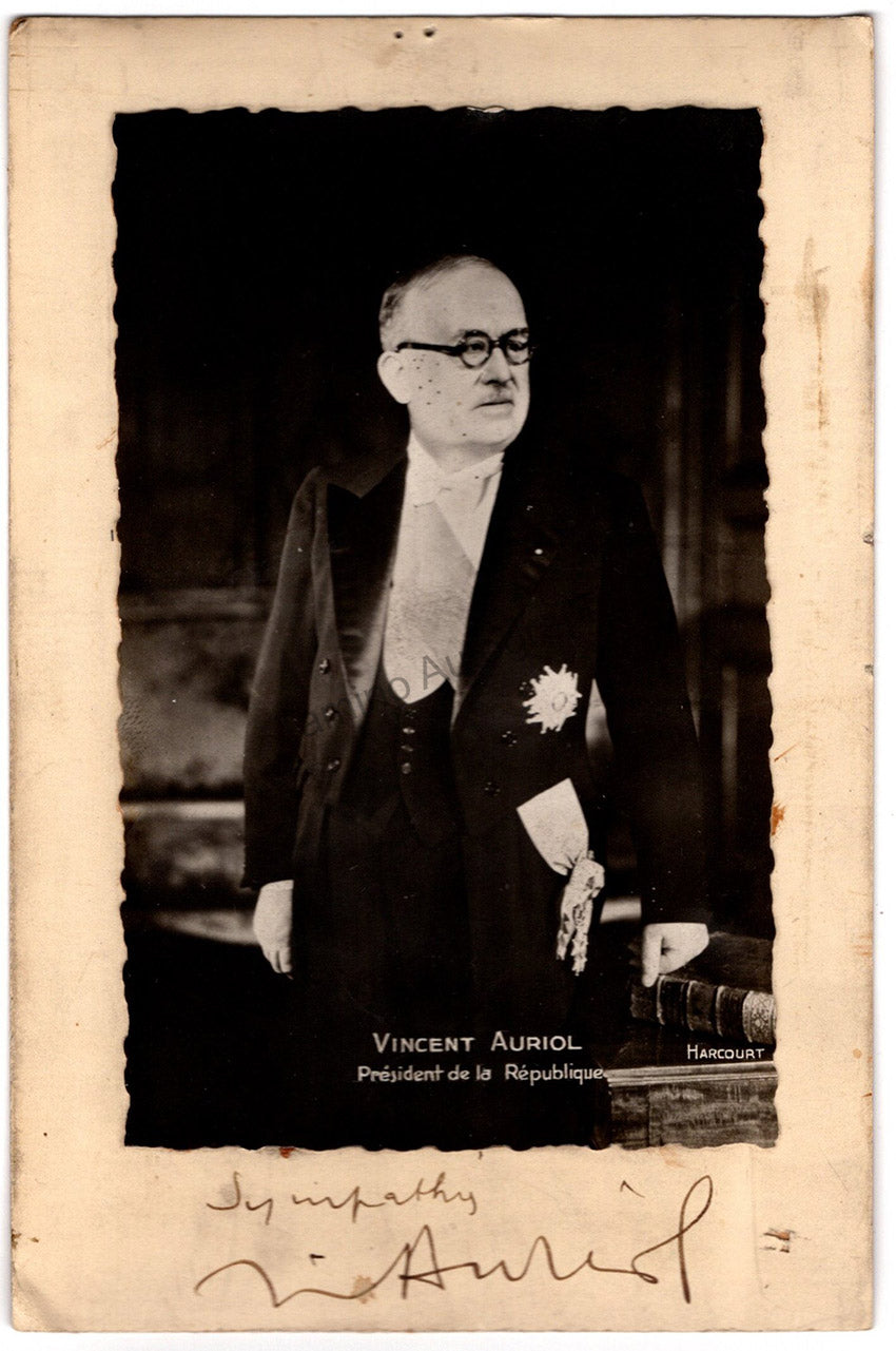 Fine photo postcard mounted on larger hard cardboard signed by Mr. Auriol on the cardboard.  Total size is 4.5 x 6.9 inches, minor stains, pinholes over the top border, otherwise in excellent condition.