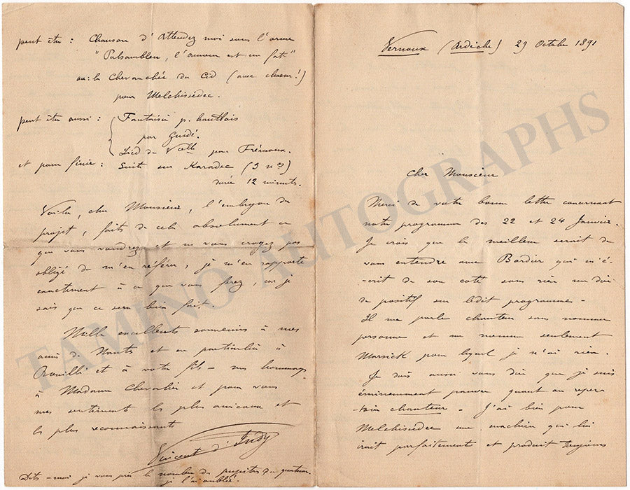 Fine autograph letter in French signed by him, dated October 29, 1891, discussing with a gentleman (the La Havre theatre Director) the concert program for a concert in January 1892: