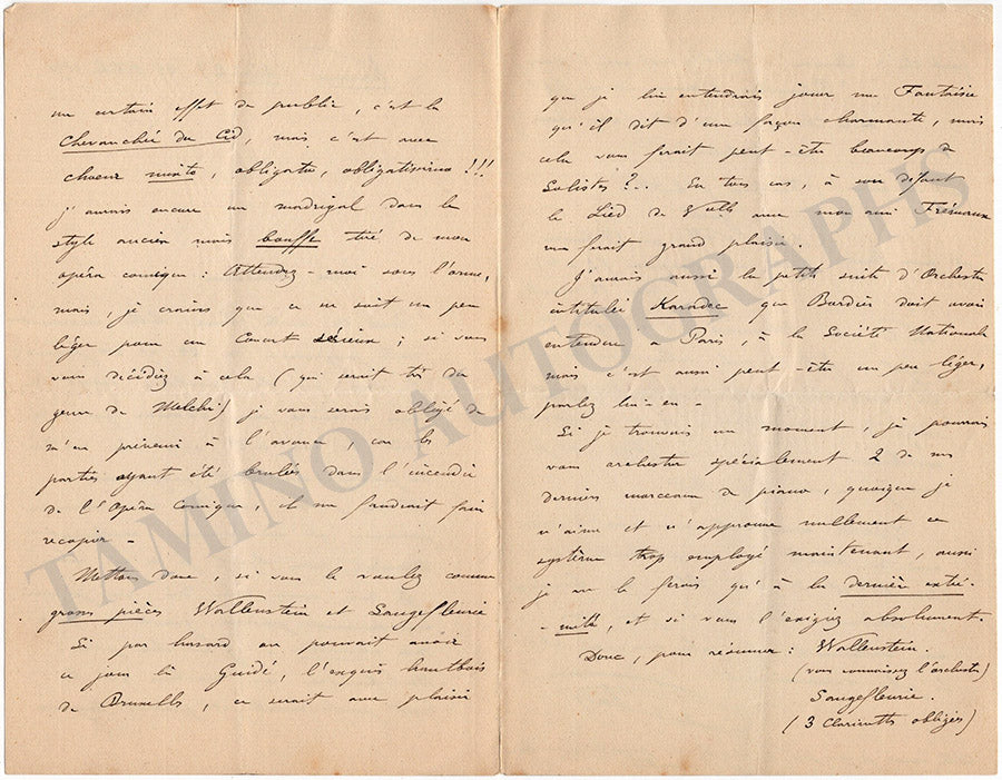 “…Je dois aussi vous dire que je suis éminement pauvre quant au repertoire chanteur. J’ai bien pour [Léon] Melchissédech une machine qui lui irait parfaitement et produit toujours un certain effet de public, c’est la Chevauchée du Cid, mais c’est avec choeur mixte, obligato, obligatissimo!!!!…”.