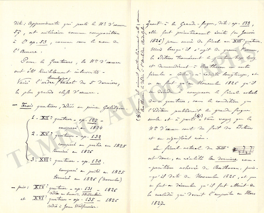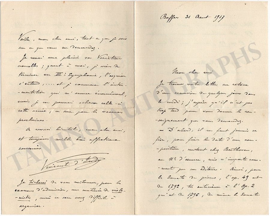 “…D’abord, il ne faut jamais se fier, pour fixer la date d’une composition, surtout chez Beethoven, au N° d’oeuvre, mis n’importe comment par un éditeur. Ainsi pour la sonate de piano, l’op. 49 est de 1792, très antérieur à l’op. 2 qui est de 1796; de même la sonate Appassionata qui porte le N° 57, est antérieure comme composition à l’op 53, connue sous le nom de L’Aurore….”. At the end of the letter, d’Indy evokes the work he is attending to: “…Je viens de terminer ma IIIe symphonie, l’esquisse s’entend… et je commence l’instrumentation qui m’amuse énormément, mais je ne pourrai achever celle-ci cette année, ce sera pour les vacances prochaines…”.