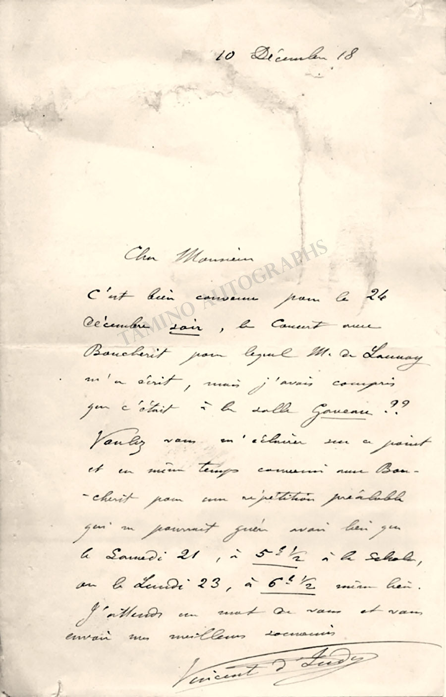 “…C’est bien convenu pour le 24 décembre soir, le concert avec [Jules] Boucherit pour lequel M. de Launay m’a écrit, mais j’avais compris que c’était à la salle Gaveau ?? Voulez vous m’éclairer sur ce point en même temps convenu avec Boucherit pour une répetition preâlable qui ne pourrait guère avoir lieu que le samedi 21 a 5 ½ à la Schola…”.