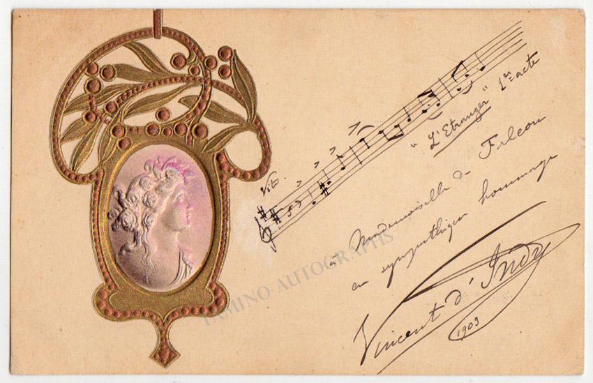 Signed postcard, dated in 1903 and inscribed, with a music quote from the first act of his opera L´Etranger, op. 53 (1898-1901), in excellent condition, size is 5.5 x 3.5 inches, rare!