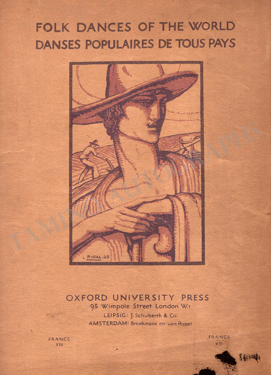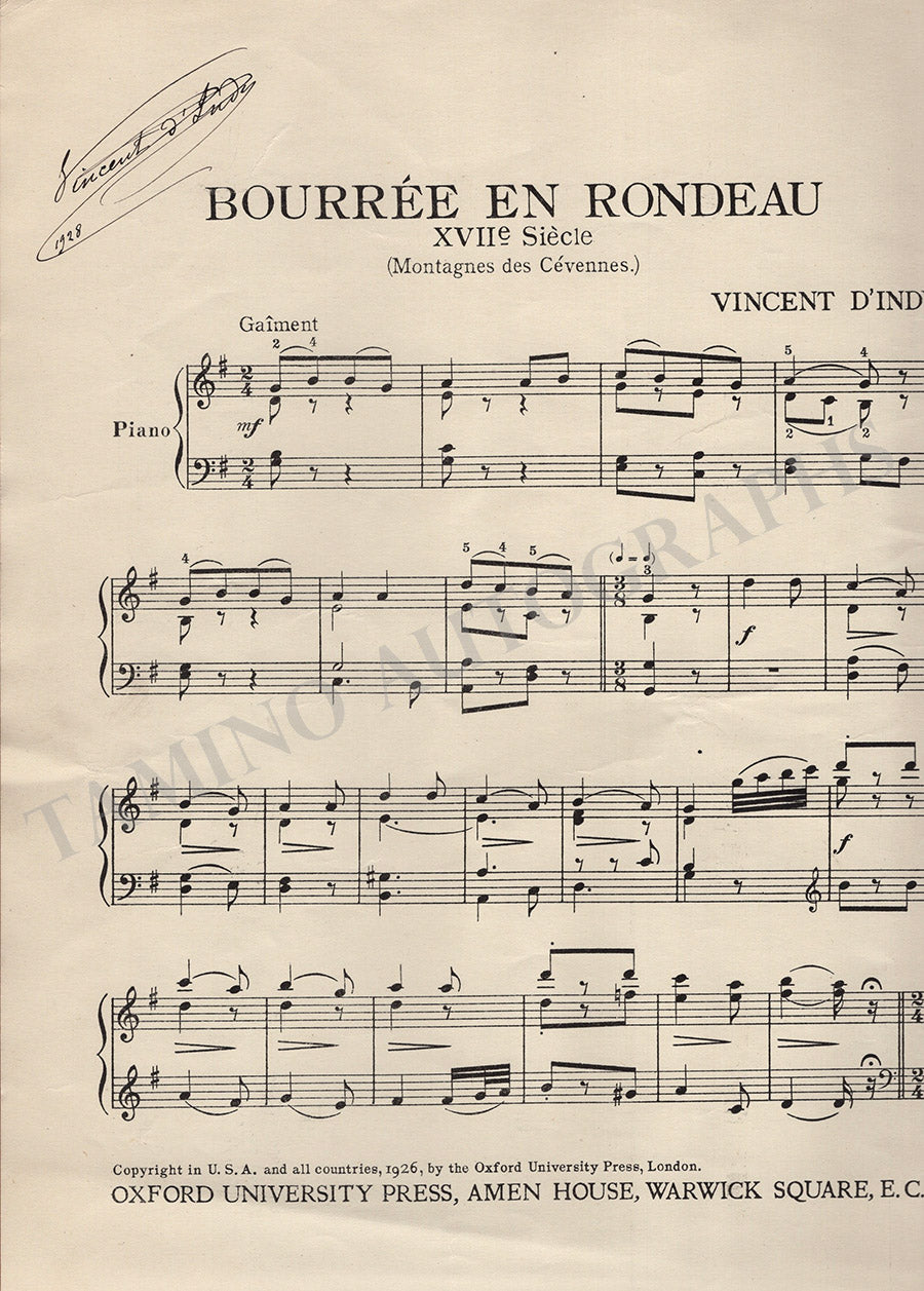 Printed music score with signature and date 1928 by the French composer and music teacher. Booklet “Folk dances of the world” by Oxford University Press, 1926, that includes the piano work “Bourrée en Rondeau” signed by D'Indy. Size is 8.3 x 11.6 inches, 2 pages, in excellent condition.