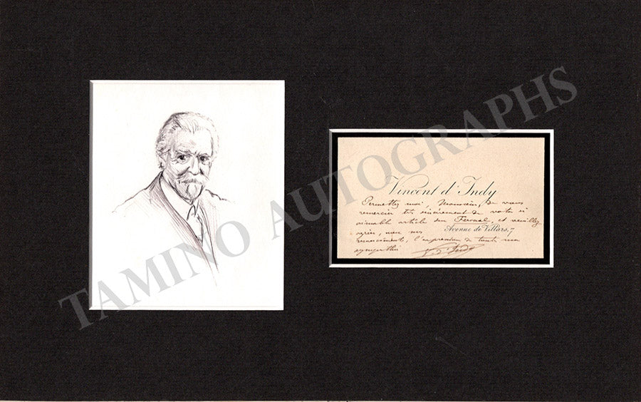 Autograph note on his business card written in French (sold untranslated) and signed by him matted with a print of his portrait. Total size is 11 x 6.9 inches, the card is 3.5 x 2 inches, print is 3.2 x 3.8 inches (visible window size), all in excellent condition.