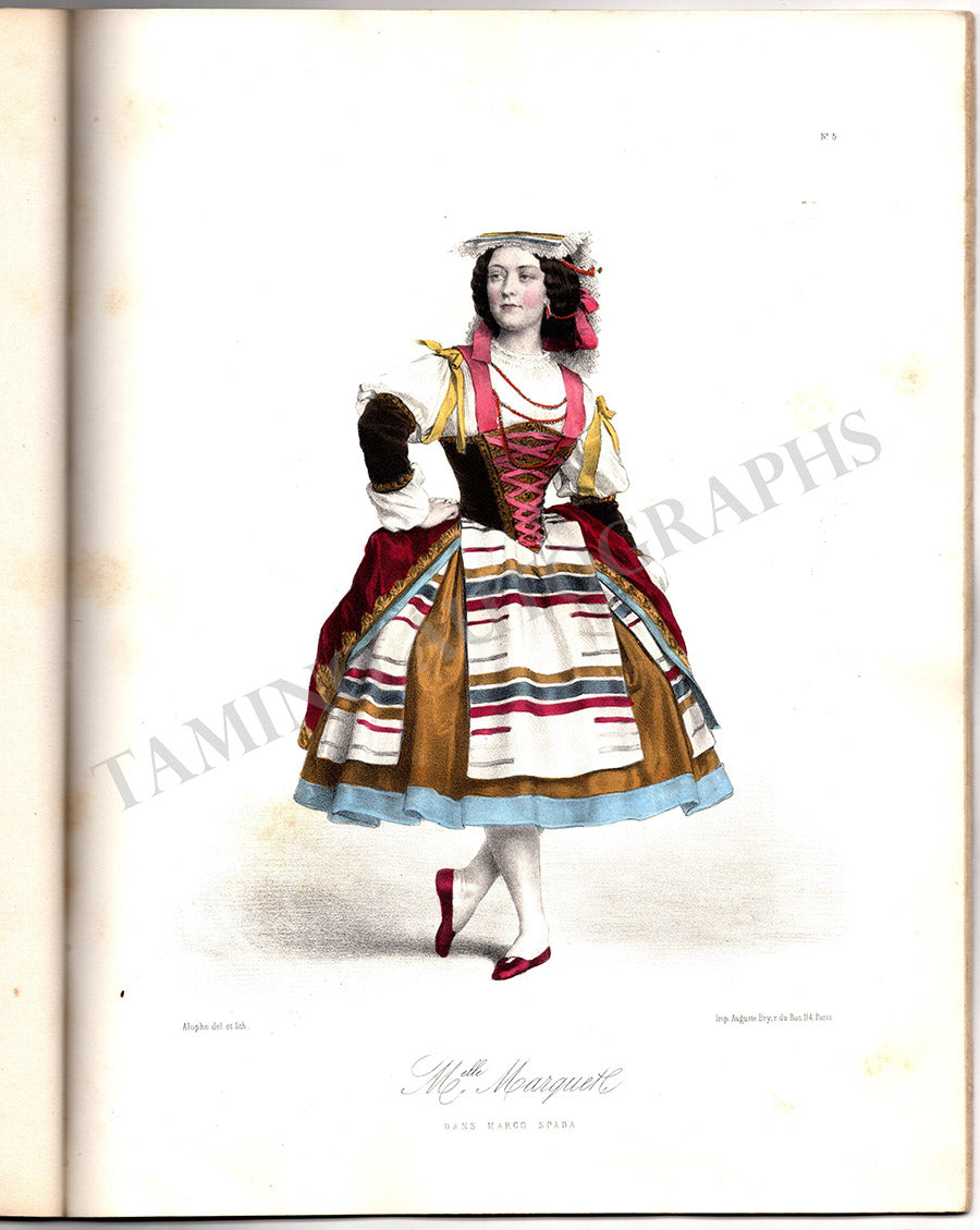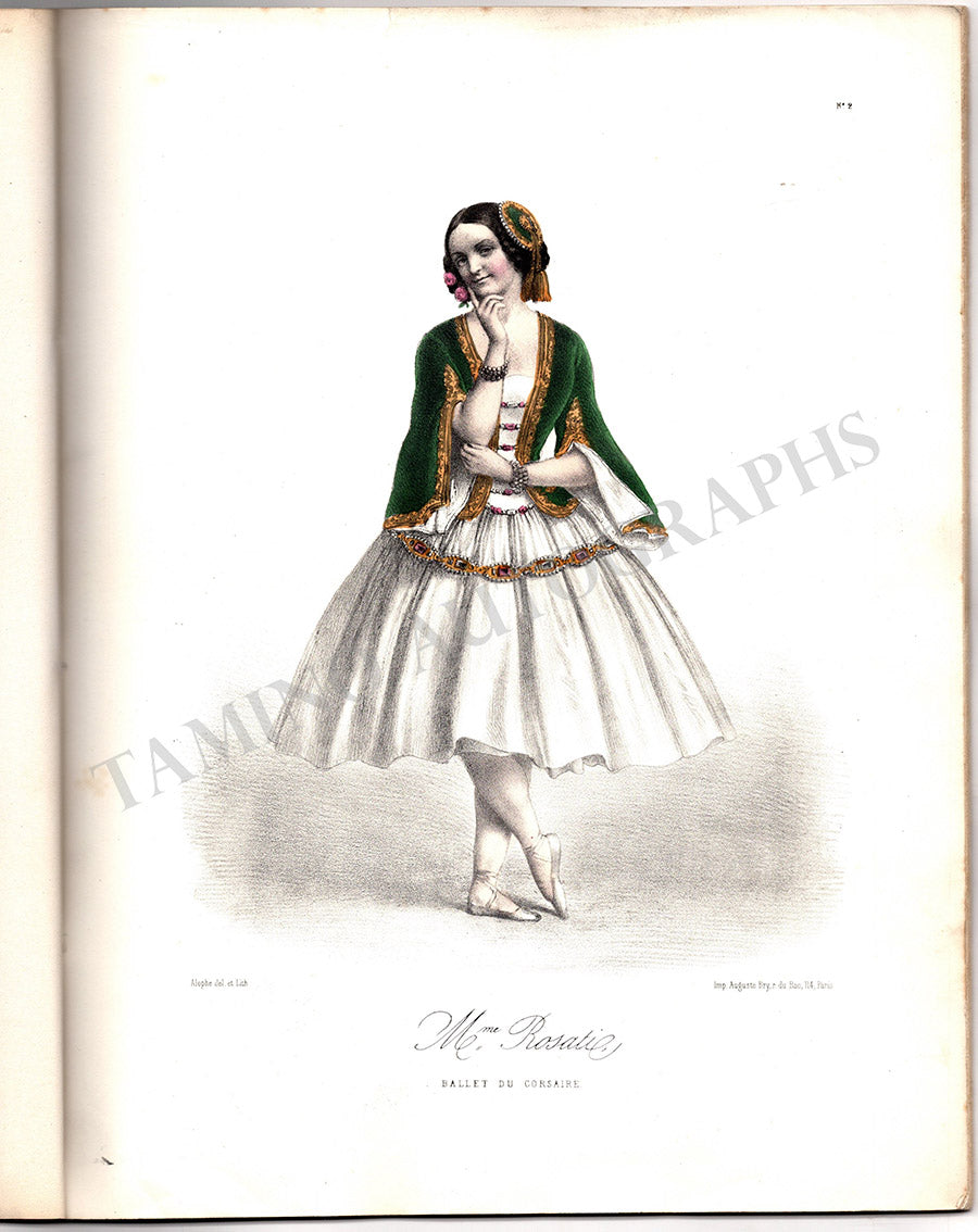Vintage book "Les Danseuses de l'Opera: Costumes des Principaux Ballets" by artist Alophe with 14 hand-colored lithographs of leading ballerinas of the 1850s such as Marie Taglioni, Carolina Rosati, Amalia Ferraris, Adeline Plunkett, Eugenie Fiocre, Emma Livry, Louise Marquet, Zina Richard, Sophie Cassegran, and Vibon.
