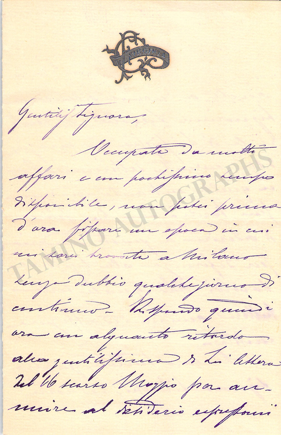 Autograph letter in Italian (untranslated) signed by her. Size is 4.5 x 7 inches, 3 written pages in 1 folded sheet, letterhead, in very good condition.