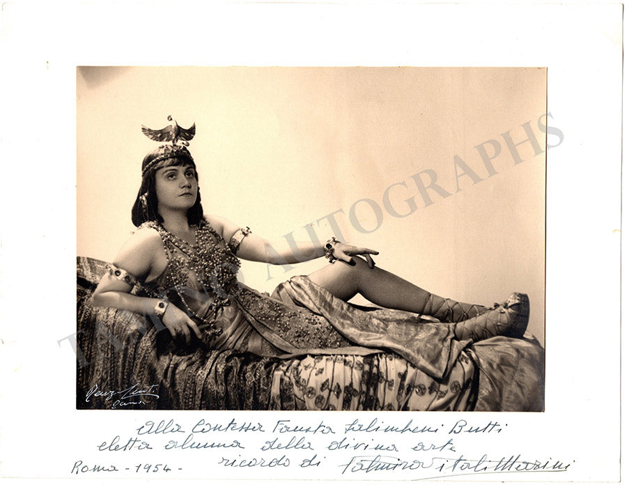 Italian mezzo-soprano (1910-1983), signed photograph, shown in role (likely Amneris in Verdi's Aida), dated in Rome in 1954. Signed 6.5 x 9 inch photo mounted on soft cardboard, total item size is 9 x 11.75 inches, signature and inscription is on the cardboard at the bottom. Hand-written signature of photographer on the bottom of the photo itself. Small bends, otherwise in very good condition.