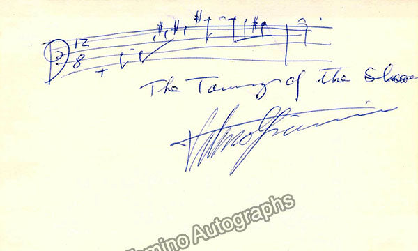 Card signed by him with 2 bars of music from "The Taming of the Shrew" (1950). Size is 5 x 3 inches, in excellent condition.
