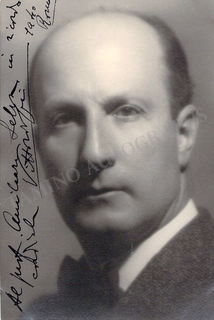 Fine black-and-white photo postcard signed and inscribed by him with a short sentiment dated in Roma, 1940; photo by Foto Vaghi (Parma). Size is 3.1 x 4.5 inches (trimmed from a larger format), in excellent condition.