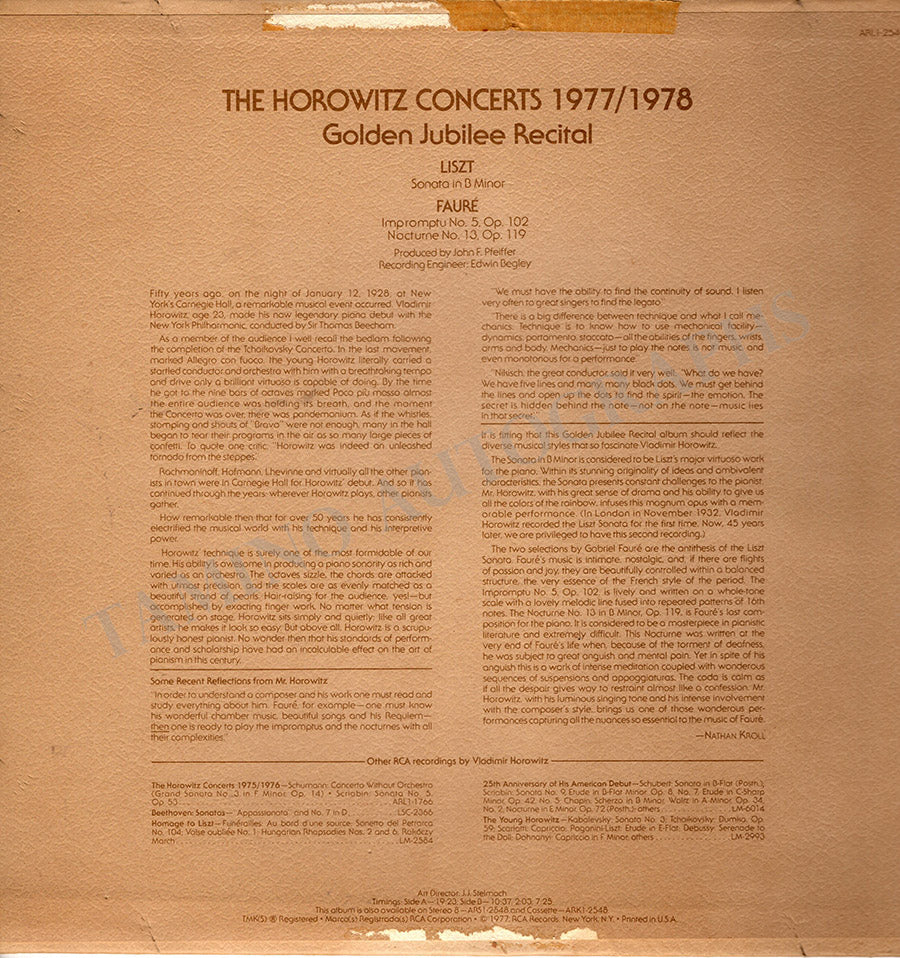 LP sleeve (RECORD NOT INCLUDED) of the Liszt Sonata in B minor as part of his Golden Jubilee Recital signed by the pianist and his wife. Size is 12.25 x 12.4 inches, in excellent condition.
