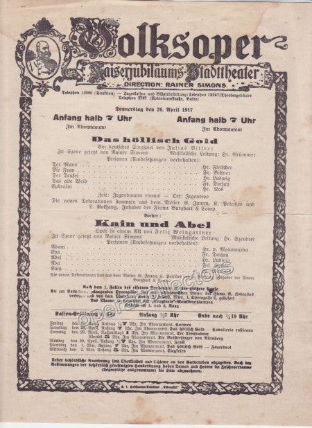 Playbill from the Vienna Volksoper. Das hollische Gold by Julius Bittner & Kain und Abel by Felix Weingartner, with amongst others Josef von Manowarda, 26 April 1917. Size is 8.75 x 11.5 inches.