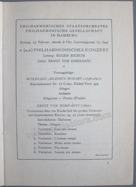 Concert program with Ernst von Dohnanyi performing his own piano music - February 13th, 1939 Hamburg - 21 x 14,5 cm. Paperback. 12 pages Hamburg, Conventgarten, Grosser Saal, Philharmonisches Staatsorchester Hamburg. Cond: Eugen Jochum, Soloist: Ernst von Dohnányi, piano. Mozart: Klavierkonzert Nr. 17, Dohnányi: Variationen über ein Kinderlied für Klavier und Orchester, Beethoven: Sinfonie Nr. 7